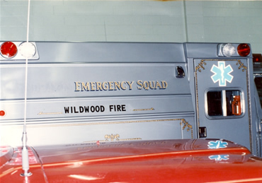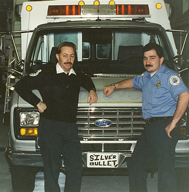 While waiting for delivery of a new ambulance, the Wildwood Fire Department used a "loaner" ambulance from VCI. At left, Larry Lillo and Chris D'Amico pose with the "Silver Bullet".